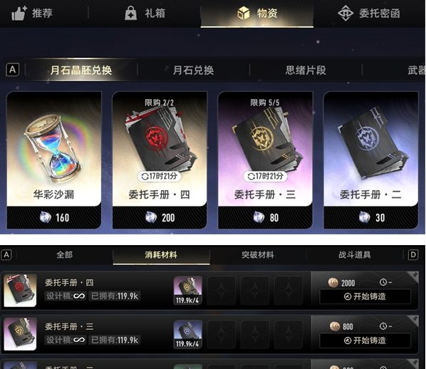 获取方法:高级委托手册可以在商店购买、或铸造界面通过四合一的方式获取