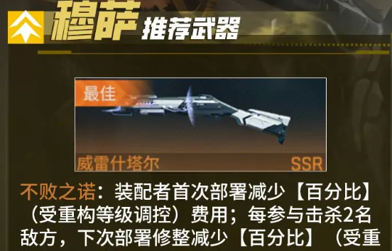 武器的选择没有什么好犹豫的,直接挑选威雷什塔尔,这把武器的被动效果简直就是量身打造,在装备之后第1次部署就可以减少费用。具体减少多少百分比是根据武器重构等级而调整,一开始部署的压力就可以小一大截。比较实用的是每参与击杀两个敌人,那下一次部署休整的时间也会减少,最高可以叠加三层。用上这把武器,那角色的强度和手感都可以更上一层楼。