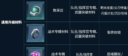 武器与模组养成道具也可以盯着武器兑换币,还有模组数据单元,主要就是靠深红武装副本。深红武装每一周打三次,不仅可以获得两个道具,并且还可以出活性合金锻料。这可就是医疗还有工程专精再提升的关键材料,必须要优先去刷满。还有专精以及突破材料,不同职业的队员所需要对应的材料也是有所区别的,千万不要搞混了。实训补给箱,还有实训仪都可以通过打副本拿到,队员以及指挥官战术专精的突破全部都会靠他。