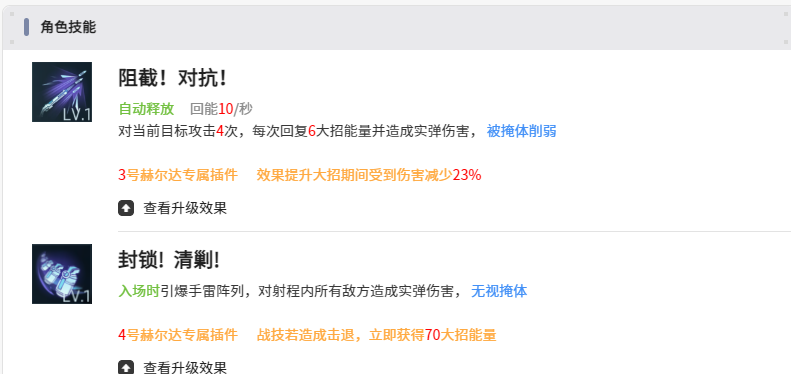 装备和插件方面不可以忽视的就是威雷什塔尔,每1.2秒就可以射出一发,而且还可以造成50%的溅射伤害,完全可以符合群攻的需求。在提升到高阶之后,还可以增加侧击的伤害,可以进一步的强化输出。插件优先去凑专属的插件,例如3号插件就能在大招期间有效减伤23%。4号插件可以让战斗技能在击退时还可以回复70点的大招能量。另外还需要搭配5号插件以及6号插件,这4个专属插件在凑齐之后,那攻防能力自然就可以上一个全新的台阶。