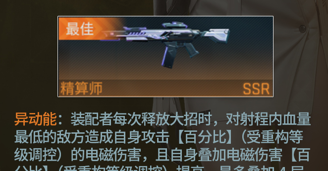 米多利的武器自然就应该选择精算师。这把武器的异动能效果就很符合角色的输出节奏。每一次在释放大招时,就可以给射程内血量比较低的敌人直接造成电磁伤害,并且还可以叠加电磁伤害的提升效果。在叠满之后,大招伤害就会拥有明显的提升,不管是打精英怪或者是清理杂兵,效果都是很出色的。而且这把武器的伤害也会受到重构等级的调控,后期会伴随着重构等级而提升输出能力还可以更上1层楼。
