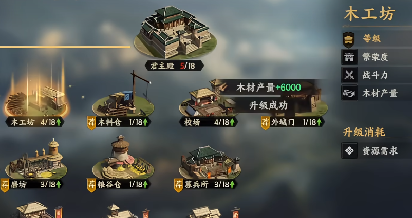 君主殿是主城建筑里面最主要的一个,这其实就是游戏里玩家的主城,君主殿决定着所有建筑的最高上限,其他所有的建筑等级都要在君主殿之下,这就代表了在游戏里,君主殿的提升是最重要的,另外随着君主殿等级的提升,还可以解锁其他各种不同的建筑,能让玩家整体城池的能力最大化,提升君主殿需要粮食,木材,还需要石材这些基础的材料,除了这些最基础的设定之外,还需要让繁荣度达到标准,很多玩家都会发现在资源达标之后,但是无法升级,这就表示玩家当前的繁荣度存在缺口,可以优先去建筑其他的资源生产场景,说,就比如建造民居、木工坊这样的场景,能快速提升整个城池的繁荣度。