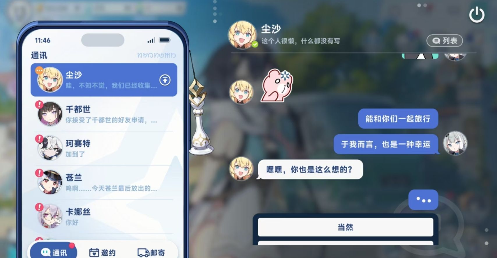 心链系统主要由通讯、邀约和邮寄三大功能组成,里边只会出现玩家已获得的角色。其中,通讯功能相当于聊天,它可让各位与任何一名角色进行对话,每阶段的对话完成后,还能拿到星之砂奖励。该功能每天使用的次数不受任何的限制,各位若是有特别喜欢的角色,可用她们头像后方的置顶功能,让她们能排在列表的最上边,方便自己去查看该角色是否有新的聊天话题。同时,各位在点开各角色的聊天界面后,还可在左上的列表里,去查看自己与角色之前所聊的全部内容。