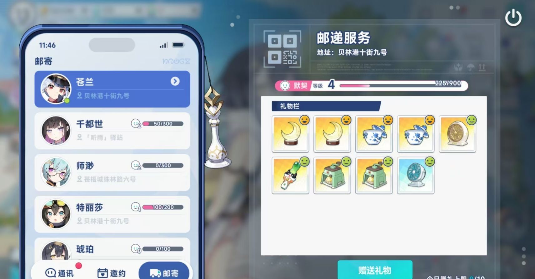邮寄功能可让人们赠送礼物给角色,每天可最多赠送10次,且所有的角色都共享次数,成功赠送后可提高角色与玩家的默契度。不同礼物所提供的默契度会受礼物品质和角色喜好所影响,品质越高的礼物能提供的默契度也就越高,同等品质下,若给角色赠送她们喜欢的礼物,所收获的默契度经验也要比赠送她们不喜欢的礼物要来到高。角色喜好的礼物会被贴上一个黄色开心的表情,她们觉得一般的礼物会有绿色平淡表情,各位可在选择要赠送礼物的角色后,查看她们各自对礼物的喜好。