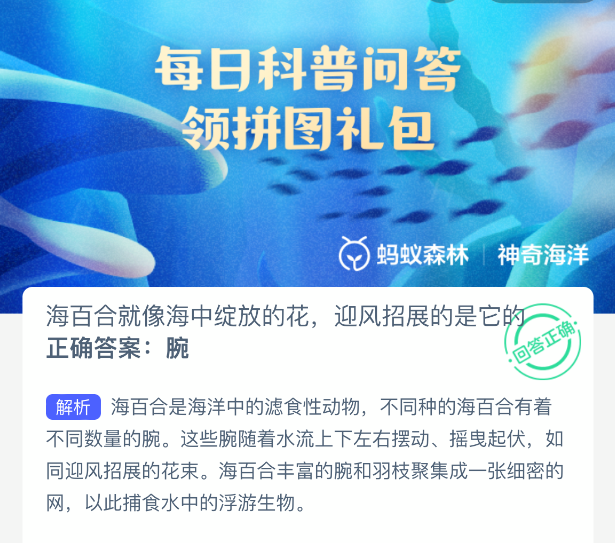 以上就是海百合就像海中绽放的花,迎风招展的是它的?神奇海洋今天答案最新2025年11月7日分享,更多相关攻略内容,请点击关注更新!