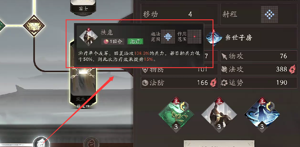并且荀彧的技能效果还有一个“扶危”的能力,他可以治疗单体友军单位,恢复基于自身法术攻击108%的兵力,并且持续性的为单体目标赋予治疗效果提升15%的buff,在下一次恢复时,甚至可以直接拉满友军血量。