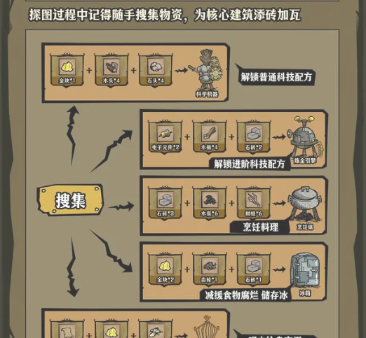 探图过程中记得随手搜集物资,为核心建筑添砖加瓦