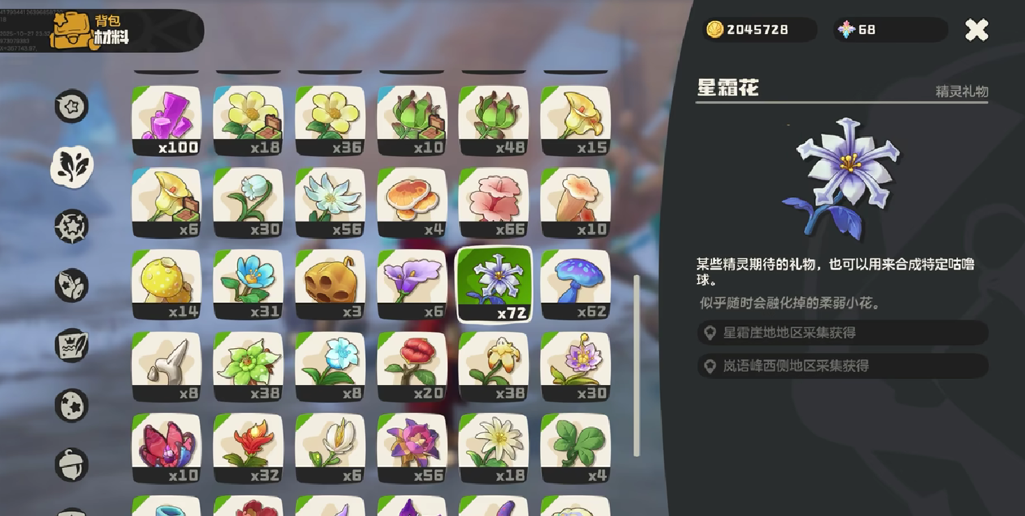 星霜花:对于环境温度是特别敏感的,所以说玩家想要获取星霜花的时候,可以选择正午或者是夜里面去刷取。玩家在刷取星霜花的时候直接去雪山地区或者是海拔比较高的地方,像岚语峰西侧这个其实是比较固定的可以获得。星霜花的地方,不过玩家如果说想要获取星霜花的时候,自己也要注意,需要携带耐寒的宠物,才能够有效的提高获取的概率。