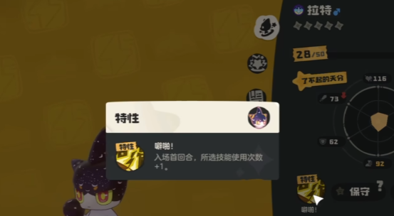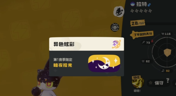 抓到拉特后先把等级升到40级,它会第一次进化成酷拉之后继续练级,等满足条件就能进化成终极形态风暴酷拉,而异色炫彩的外观,就是在进化成风暴酷拉这个阶段,靠变异玩法随机解锁的,不是每一只都能出,养成的时候性格选择特别关键,因为拉特主要靠魔攻打伤害,所以优先选保守、稳重这种能提升魔攻的性格,要是想让它出手更快,胆小、急躁这类加速度又不削弱魔攻的性格也很合适。