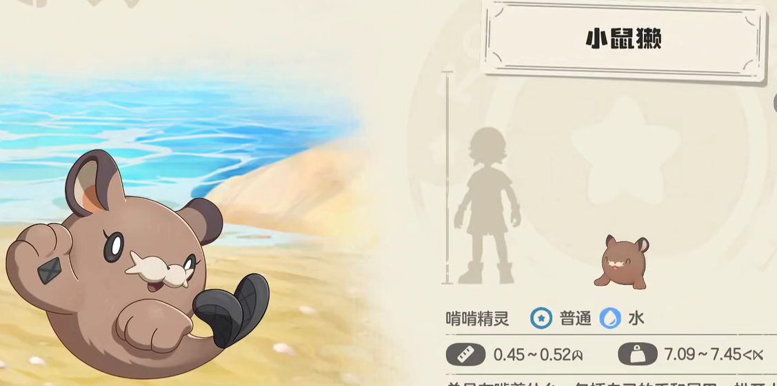 小鼠獭在游戏当中的属性为“普通”以及“水”属性,特征是拥有保守派的技能数值,当等级达到30级时,进化成为“高尾獭”,等级达到48级时,进化成为“卷胡巨獭”,在游戏内,玩家可以直接选择前往到治愈兔附近的“海滩”中,即可直接捕猎小鼠獭。