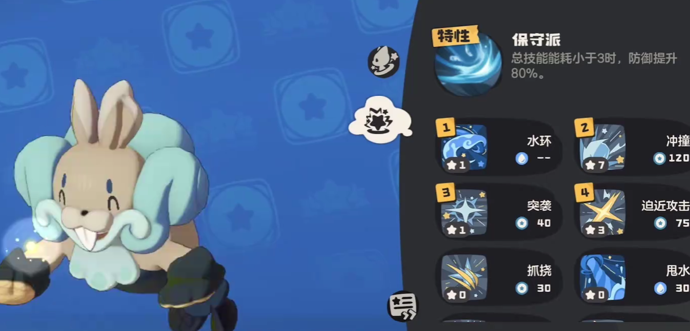 卷胡巨獭主要技能为,水环、冲撞、突袭、迫近攻击、抓挠、甩水,同时在甩水攻击命中时,可以为敌人施加一层潮湿印记效果,在战斗当中,保守派的特性,可以保证他在总技能消耗小于三时,防御力提升80%。