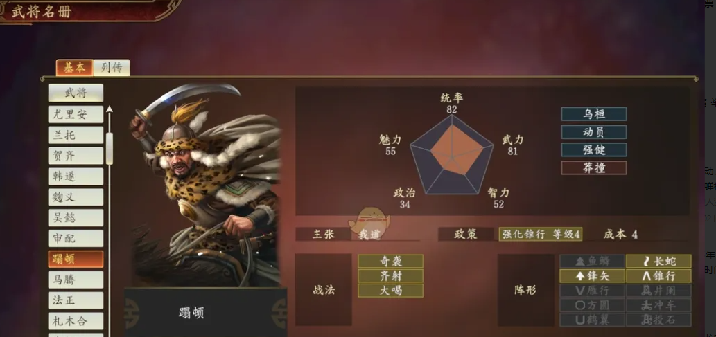 三望中做为全新副将,蹋顿也继承了其历史上乌桓王勇猛的特点,能为携带武将提供较高的攻防属性,还能额外提供续航效果。