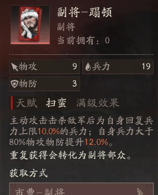 蹋顿获取方式目前有两种,一种时通过江亭取物活动抽奖,拿到指定代币、在活动商店兑换,另一种是在副将商店,使用副将币兑换(感觉副将商店还是兑换专属副将好一点)。