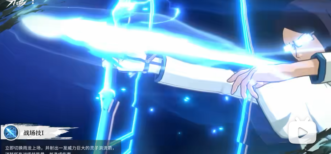 战斗时在切换了石田雨龙上场以后,雨龙会向着前方的敌人射出一发有着巨大威力的灵子洪流箭,灵子洪流箭会直接把自身所积攒的战场技能量全都消耗掉,该技能属于高伤害技能。