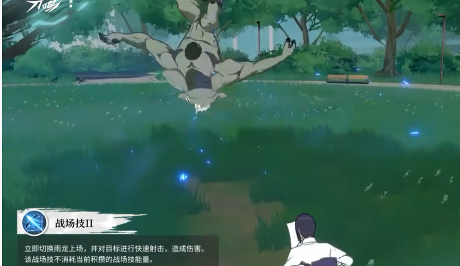 用来封灭后,雨龙会直接踩住敌人并且借着敌人的力道向后用力一条,跳到空中会对敌人射出箭矢造成伤害,此外,若是在石田雨龙的战场技生效后使用该技能,技能在命中敌人以后还将会提升雨龙i积攒的战场技能量。