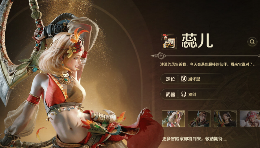 蕊儿是游戏里众多冒险者的其中一个,这个角色会使用双剑在游戏里战斗,这是很多玩家都比较喜欢的一种武器,主要是因为双剑相对来说比较灵活,并且每一次对战的时候都可以随时释放,并且双剑在战斗的时候除了有较为优秀的输出能力之外,还可以进行连击对战,玩家都可以在游戏里,流畅的展现自己的招式动作,不只能够让每一次对战更具有美感,同时也可以给对手带来巨大的打击,一般在连续输出之后都能大大削弱对方的血量,加上双剑这个角色主打的又是高爆发伤害,基本上常规的小怪都能轻松对抗。