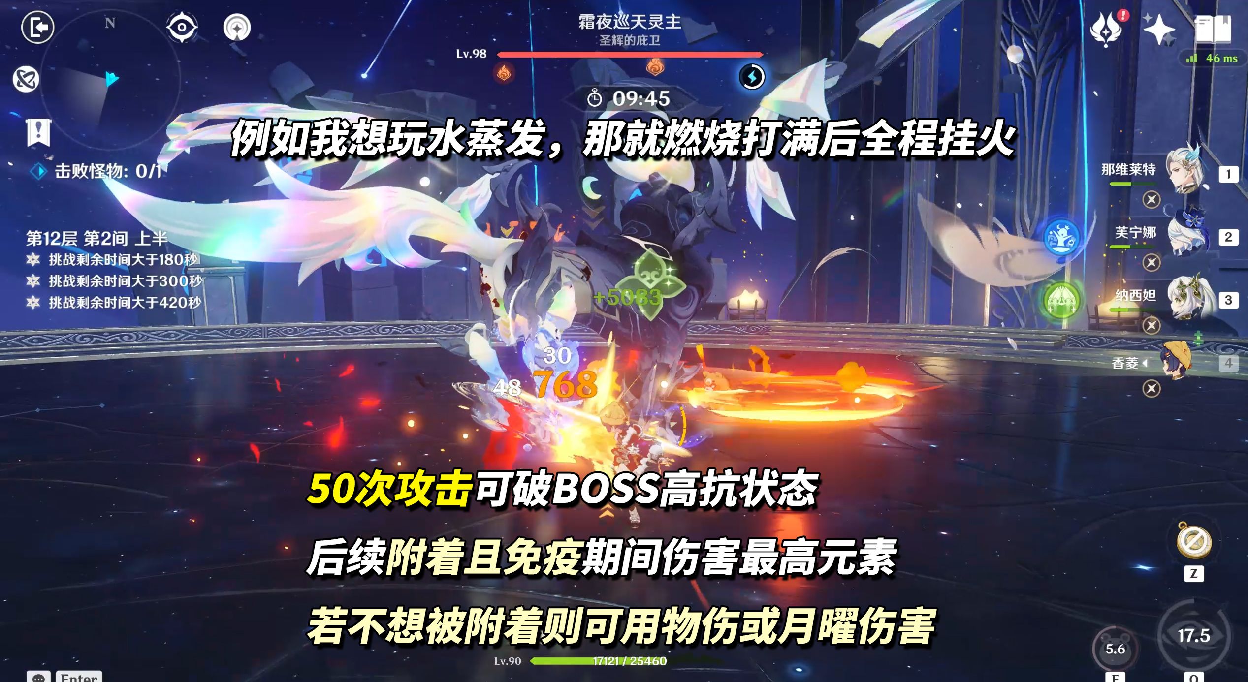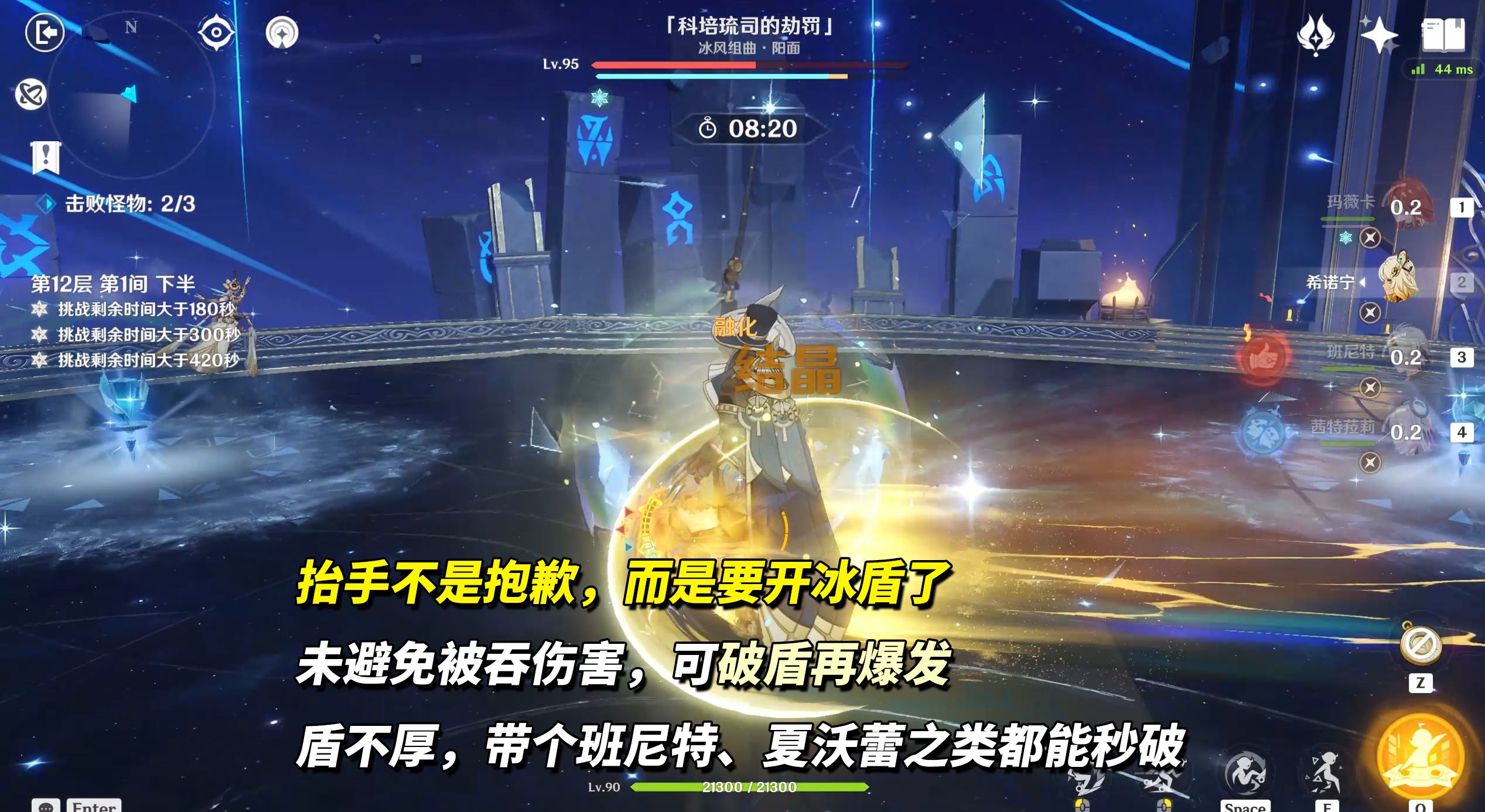 12-1下半,冰风组曲科培琉司(255万血)。当科培琉司将舞伴甩出去时,注意它手中动作,抬手会生成冰盾,易吞掉你的伤害,可等他先开盾用火伤破除后再爆发。盾量不高,班尼特/夏沃蕾等火辅就可破。