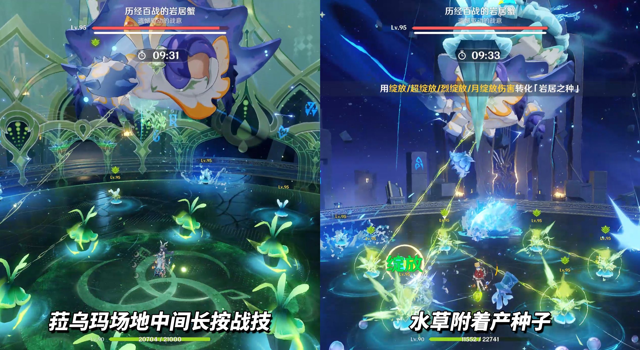 岩居蟹登场会直接飞天开盾,随后在场上留下大量的「岩居之种」,绽放反应激活6个「岩居之种」即可将BOSS破盾打下来,2种策略: