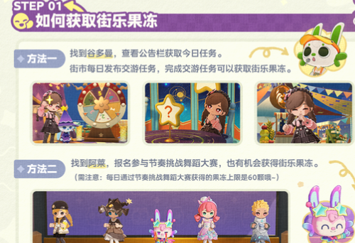 要想解锁这里的玩法,那必然就需要准备通行证,而这个通行证就是街乐果冻。这本身就属于一个被大家偏爱的宝藏零食,其实就隐藏在每一次的互动和挑战中。一天来到公告栏之后就可以找到古多曼,还可以去领取专属的交友任务。或者也可以和陌生的旅人一起结伴,然后去完成小目标,可以把那些晶莹的果冻直接放入到其中。如果大家喜欢律动,那不如就直接去找阿菜报名,可以去挑战舞蹈大赛。不仅可以收获快乐,还可以赢取60个果冻,确实是很有成就感的。