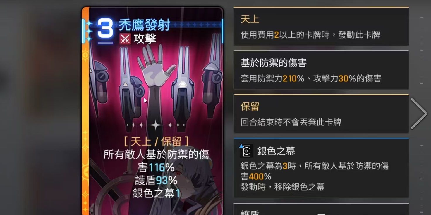 在独特卡牌方面,她的核心机制围绕“秃鹰发射”展开——该技能不仅能对全体敌人造成100%防御值的范围伤害,同时为自己附加80%防御量的护盾,并叠加一层“银色之幕”效果。当“银色之幕”累积至三层时,将触发一次全屏爆发,对所有敌方单位造成高达400%防御值的真实伤害,并清除层数,实现强力清场。