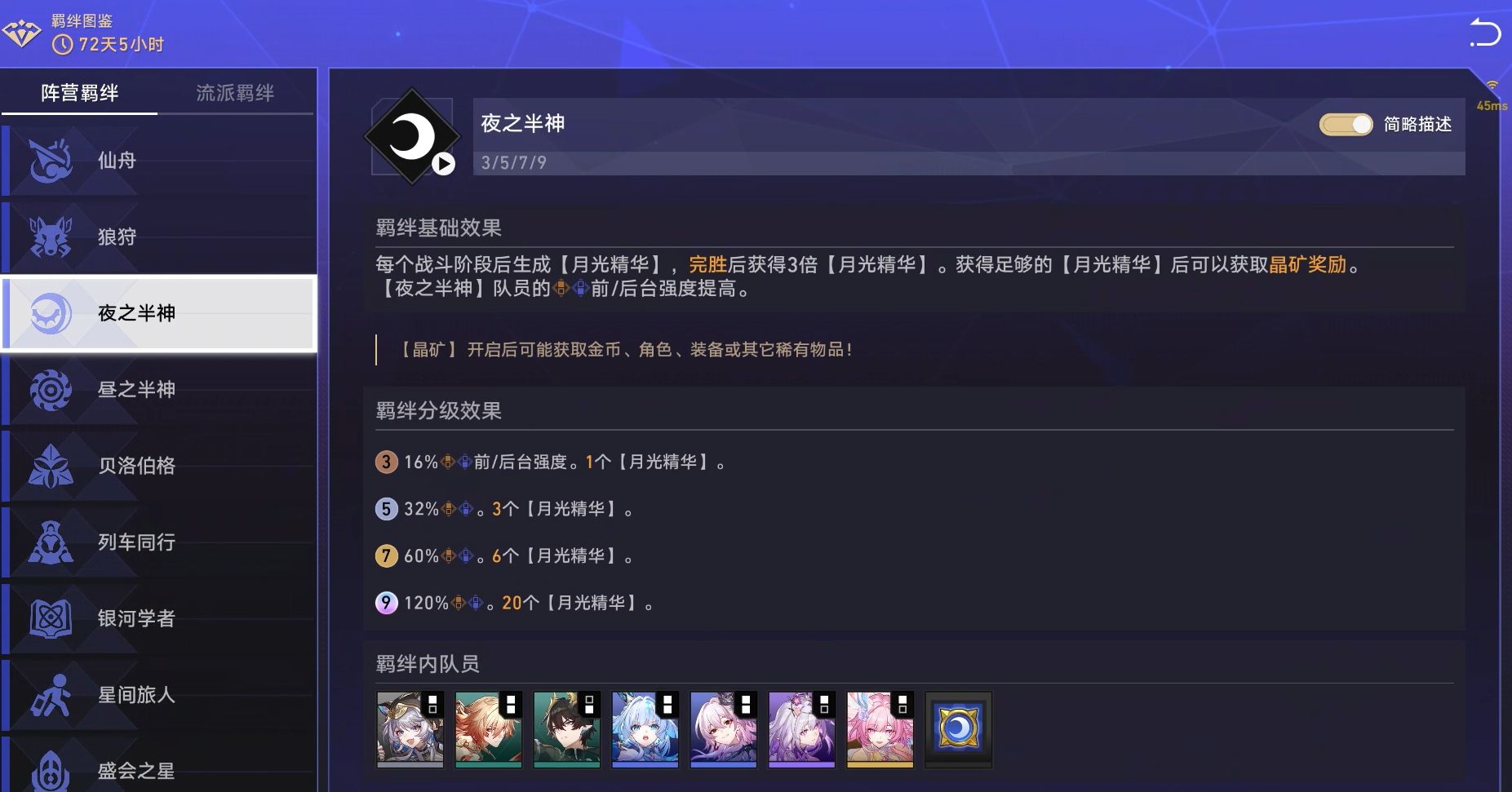 夜之半神类似于挖矿,玩家们在对局中获胜,可根据夜之半神羁绊当前的效果积累月光精华,每当月光精华足够时,玩家便能获取奖励,可为玩家积累大量的货币、装备和角色。此外,由于能组出夜之半神的角色有不少都有燃血羁绊,因此两者能互相搭配,例如7夜之半神4燃血等。