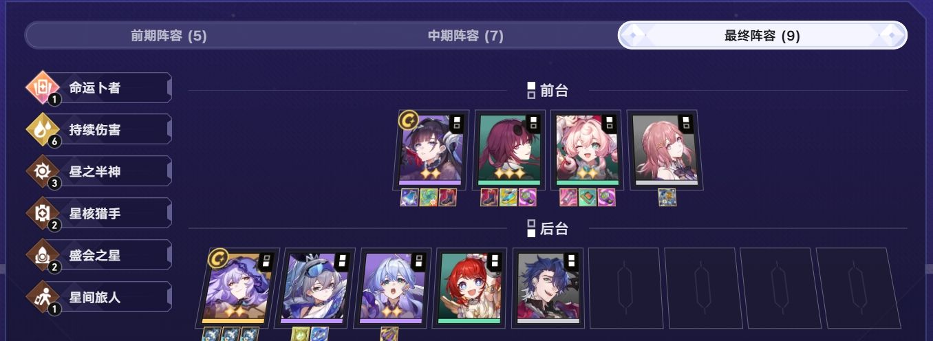 持续伤害羁绊在黑天鹅的加持下迎来了质变,即便玩家只拿到一星的黑天鹅,也能通过各种占卜效果打出极高的伤害,尤其在高段位怪物速度特别高的情况下,它们每行动一次都会受到高额的持续伤害效果。目前该流派主流的搭配有6持续伤害3昼之半神,也可组出4持续伤害后,用盛会之星、银河学者等羁绊进行散搭,需拿到黑天鹅、卡芙卡、海瑟音,并在桑博和艾丝妲中选一个来凑羁绊,也可在拿到持续伤害徽章后一起都拿组成6持续伤害羁绊,其它角色则根据自己需要来选。