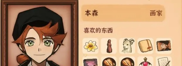 喜欢的物品:烧烤龙虾肉(烹饪)、烧烤龙虾肉⭐(烹饪)、本森肖像⭐⭐(野马湖画架绘制肖像画,头脑+魅力≤50且本森在野马湖时)、本森肖像⭐⭐⭐⭐(野马湖画架绘制肖像画,头脑+魅力>50且本森在野马湖时)、魔神药水(秋火年炼金房)、《绘画主题表现》(夏/秋/冬火年读书 研究笔记)