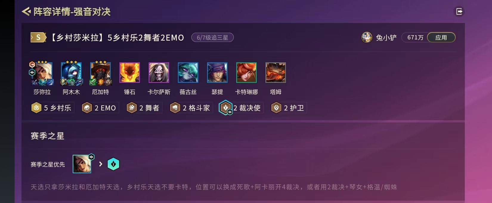 其实在这一次之所以这一个阵容会成为版本的黑马,那核心的优点就在于召唤物的性价比,并不需要花大量的经济去追高费三星,只需要凑齐九乡村的羁绊,在触发召唤效果之后,马上就会具备实力,可以扭转战局。就是那些一开始有一些不顺利,想要走冷门阵容去偷分的玩家,那不如就选择关注一下,这个阵容的实力还是比较不错的,轻松就可以起到碾压的效果。所以千万不要过多余的忽视。