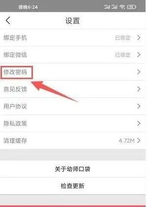 幼师口袋app怎么修改密码,在手机上打开【幼师口袋app】,进入首页后,点击【我的】按钮,点击页面右上角【设置】按钮,在设置页面,找到【修改密码】栏目,在修改密码页面,填写当前密码、新密码,点击【确定】按钮。