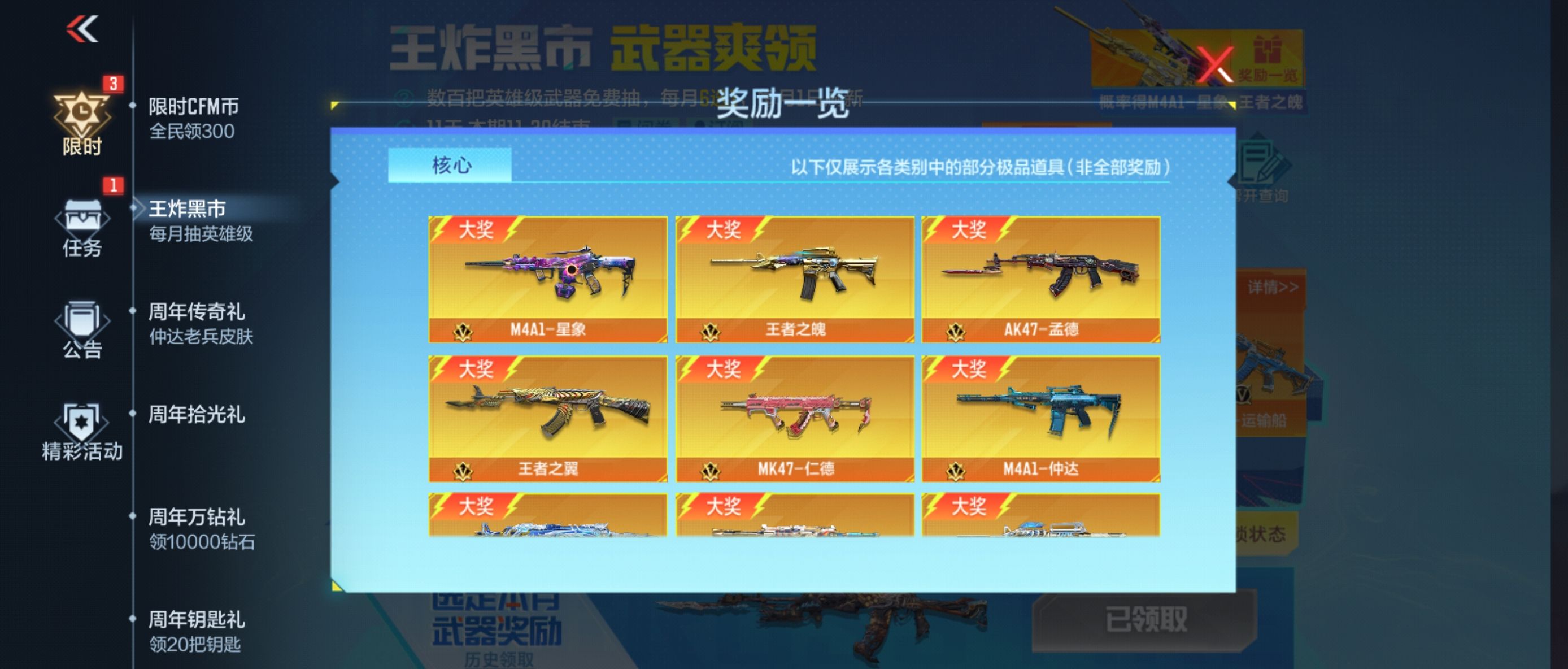 王炸黑市活动主要是利用抽卡的机制,通过抽卡的方式来获取对应的福利,一般是每月默认有三次开门的机会,这个机会只需要玩家登录游戏就可以获取,玩家需要注意,此时需要完成排位赛,也可以邀请自己的好友助力,另外,玩家还可以在获得三次机会,这样的话就有6次可以抽卡的机会,玩家在抽卡的时候会随机获得英雄级别的武器。一旦玩家领取之后,这个武器就不会再次出现。