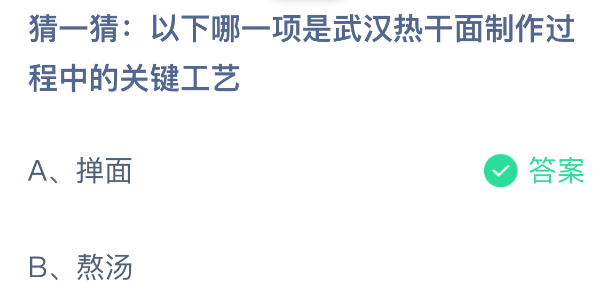 以上就是猜一猜:以下哪一项是武汉热干面制作过程中的关键工艺,支付宝蚂蚁庄园2025年11月27日答案最新,更多精彩内容,请点击关注更新!