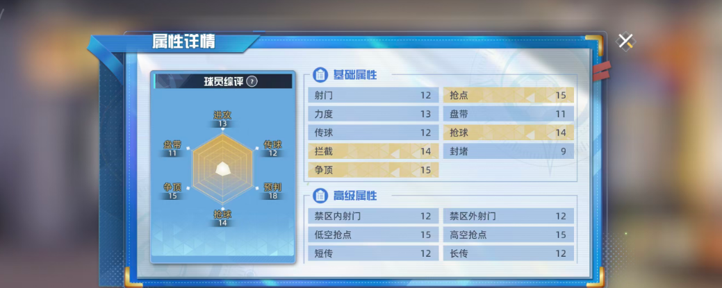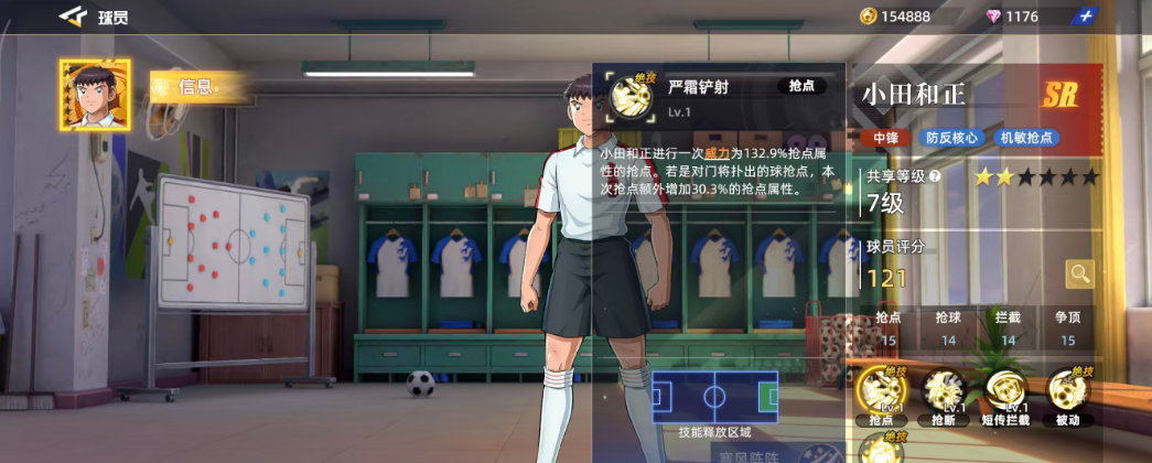 作为初始可获得的SR级球员之一,小田和正拥有清晰的场上定位——中锋。他的技能体系特别适合防反打法,机动性强,反应灵敏。基础评分为121,在同品质球员中处于中等偏上水平。其关键属性如抢点15、抢球14、拦截14、争顶15,体现出他在空中对抗和防守落点方面的优势。六维图中抢球数值相对偏低,仅为14,因此在实战中应尽量规避直接拼抢,转而发挥他在其他维度的均衡能力。