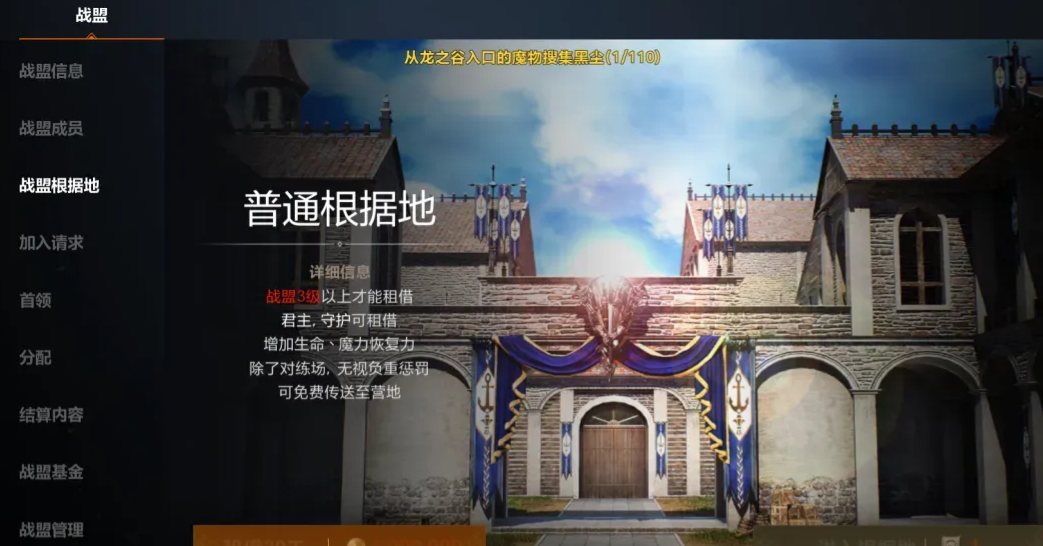 战盟等级达到3级后,战盟的君主以及守护者有资格购买战盟根据地!在战盟根据地中,成员回复生命以及魔力的速度更快哦~