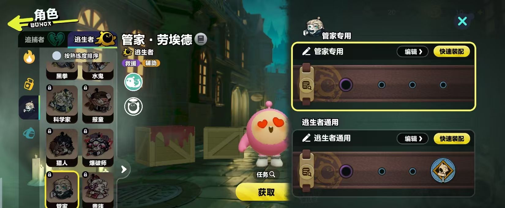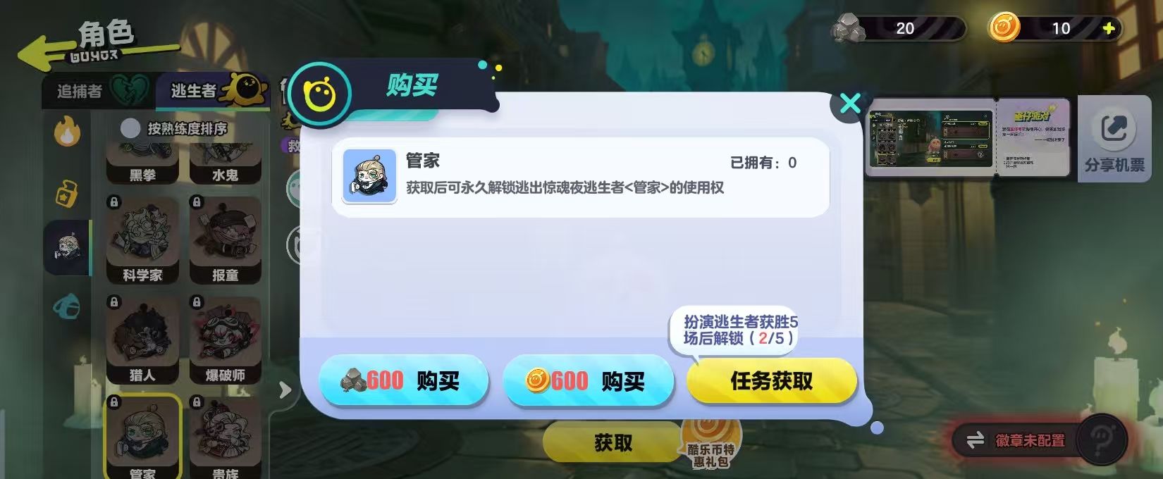 而这一个角色在获取时有三种不同的方法,首先可以通过局内的战斗还有日常任务去获取惊魂矿。这种货币就能够去购买,管家所需要的数量是600个,如果玩家觉得这个方法有一些复杂,也可以选择通过酷乐币购买,同样只需要600个,相对比较简单。通过任务也可以获取,例如扮演逃生者获胜5场之后马上就可以解锁,通过实战积累也可以免费的将它纳入到阵容中,对那些喜欢逃生玩法的玩家而言。这一个解锁方法还是很有趣味性的。
