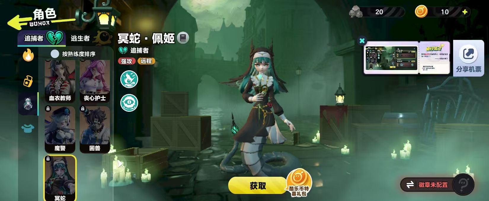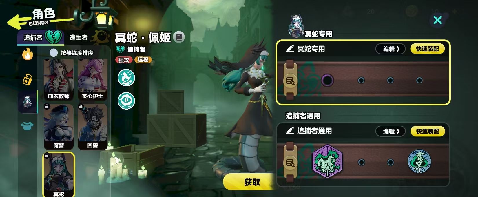冥蛇佩姬就有两种解锁方法,有永久解锁,还有限时体验。玩家可以通过酷乐币去获取,只需要打开游戏的主界面进入到商店切换到娱乐玩法,就能找到逃出惊魂夜的主题,在这里就可以直接兑换。或者是在逃出惊魂夜的玩法图标进入到准备页,点击一下左侧的角色入口,在追捕者的列表中也可以选中,然后去点击兑换。酷乐币的获取并不是很难,通过日常任务或者是正常的对战就可以获取,并不需要选择额外的氪金。