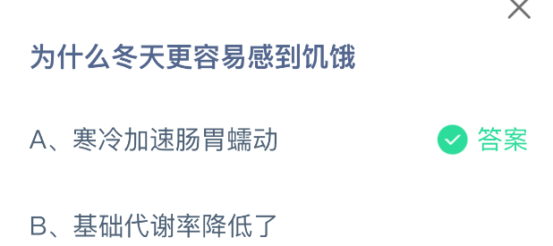 以上就是为什么冬天更容易感到饥饿,支付宝蚂蚁庄园2025年11月28日答案最新,更多精彩内容,请点击关注更新!