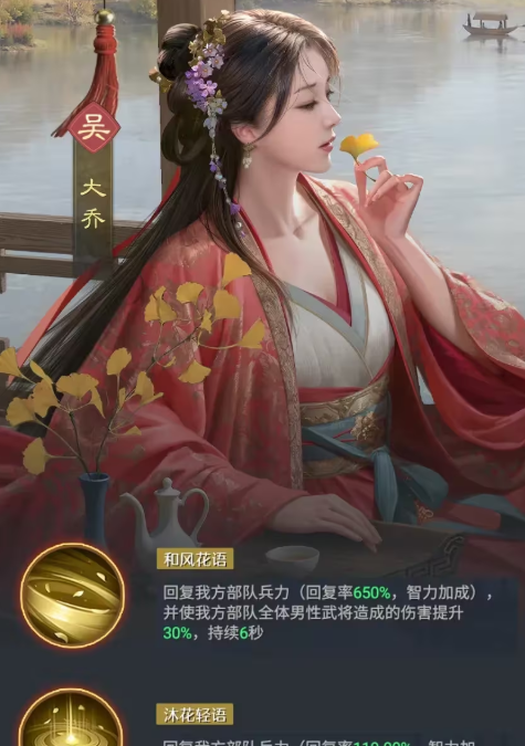 这里如果大家要玩儿这种效果的话,大家可以搭配的是吴国里面的阵营角色,这样的话,就可以利用3个吴国武将来提升整体的羁绊效果,这里要用到的就是大乔、孙坚这两个武将来跟孙策进行搭配,大乔在自身的主动技能上面,可以提升队内男性武将30%的输出,所以在这里孙策和孙权都是可以受到大乔这样的一个增益效果,并且大乔身上还有一定恢复比例的数值,所以不用担心孙策跟孙坚的输出后期后力不足,那么这里孙坚利用自身江东猛虎这个技能还可以提供一定的威压控制,威压数值目前在这款游戏当中是非常重要的一个数值,只要能够压住对面的话。我方获胜的概率是会大大增强的。