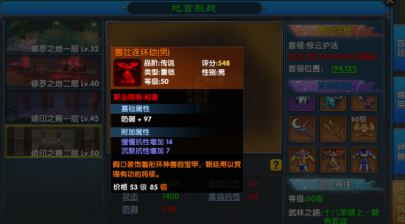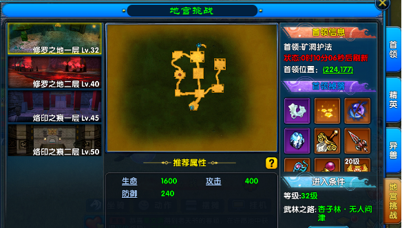 地宫共分为四层,每层的怪物配置、BOSS 强度及奖励体系均有差异,开启条件也逐层提升。一层 “修罗之地” 需玩家等级达到 32 级,且完成 “武林之路・杏子林” 剧情任务;二层开启需等级 40 级并通关对应武林之路章节;三、四层则分别要求 45 级和 50 级,同时满足相应剧情进度。建议玩家按等级梯度逐步挑战,避免因战力不足导致团灭。