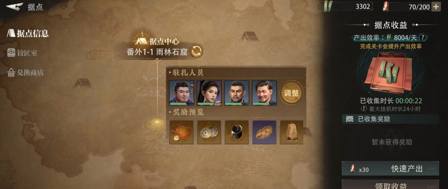 辟邪物在盗墓笔记启程中目前有两种获取方式,各位在过主线和秘门就能在各地图里开箱获得,部分主线还会给予玩家辟邪物作为奖励,但该方法获得的辟邪物品阶都不算高,为角色带来的加成也相当的有限,因此也只是作为过渡来使用。而当玩家解锁了番外玩法后,可在完成番外后将其作为自己的据点,能持续不断地从它那获取挂机收益,这些收益里就包括了辟邪物。产生的收益可随时领取,最大挂机时长为24小时,达到上限后据点不再进行任何产出,除非玩家将收益领走。同时,玩家也可消耗30体力让据点快速产出奖励。