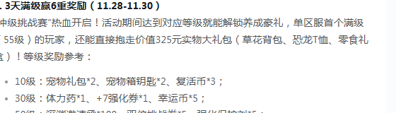 冲级党一定要参加三天满级赢6重奖励的活动,活动的时间是11月的28日到11 1月的30日。单区服首个满级玩家就可以直接抱走草花背包,恐龙t恤等一系列实物大礼包。10级,30级,还有50级,还可以获得宠物礼包以及强化券。每日签到也有惊喜,第7天就可以拿到12强化券,还有高级变换物资。刷副本时还能有机会获得更多的奖励。所以大家都可以去关注一下。总之,目前的游戏奖励还是很丰富的,玩家只要对这款游戏感兴趣,都可以了解一下。
