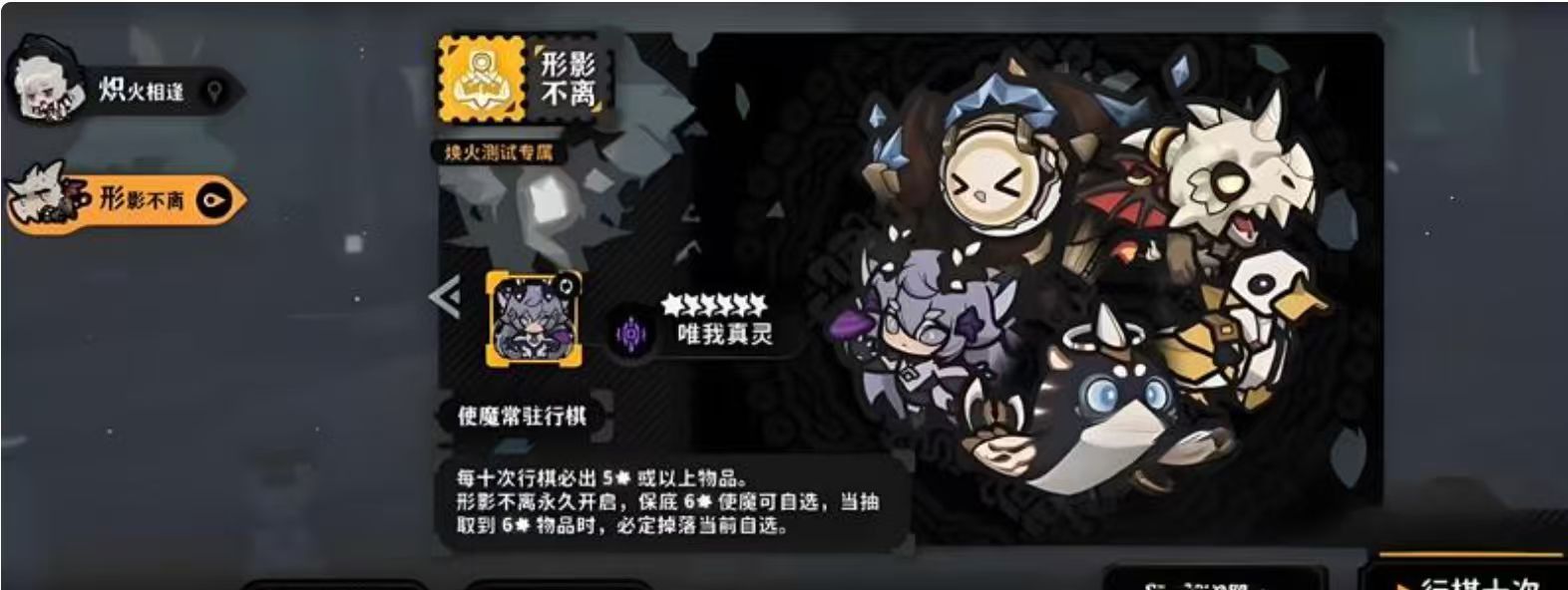 游戏中抽卡主要围绕形影不离、炽火相逢两个卡池展开。形影不离为常驻卡池,长期开放,成为玩家补充主力使魔、逐步提升阵容的基础手段;炽火相逢一般以限时卡池形式登场,但核心运行逻辑与常驻卡池相同,因此玩家只需要学会常驻卡池的抽卡规律,就能够掌握炽火相逢卡池的抽卡节奏。两大卡池均有单抽和十连抽两种形式供玩家选择,使轻度玩家和重度玩家都有适合的玩法。