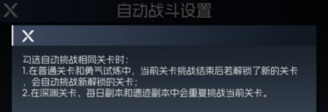 这里还有一个选项叫“复活币不足退出”,若是你勾了这个选项,那么角色死亡之后,如果复活币用完,系统就会直接退出副本了,还不用你自己手动退出。再介绍多一个很实用的功能,也就是“自动挑战相同关卡”,这个就能让你在深渊、每日副本和遗迹副本里面反复进行挑战,要是普通的关卡或者是勇气试炼,系统也会帮得上忙。所以如果你是想要反复刷的玩家,这个功能肯定是不能错过的。