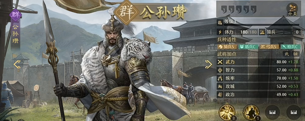 第二个为大家推荐的就是公孙瓒,公孙瓒这个武将目前在游戏当中其实带来的范围输出也是比较强势的,他作为一个辅助型的武将,目前在使用自身技能的时候,大部分都是一些扇形的范围效果,如果放在他团队增伤上面的话,其实他有一定的主将技能可以用起来,比如说他的白马从义这个技能在游戏当中搭配了高额的伤害之后,还可以提升我方其他友军身上15%的一个武力数值,所以后期他在搭配一些弓兵角色的时候,其实带来的武将激活效果会达到一定的羁绊,那么此时带来的远程压制能力也会更强一些,比如说他就可以搭配孙权,周瑜这类武将进行核心搭配阵容。