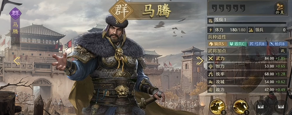 在这里第一个为大家推荐的就是马腾,马腾他在游戏当中是可以用来克制骑兵的一个武将,目前他作为主将的话,利用自己的战场技能可以带来一些强攻的效果,而且利用他的固定能力,在游戏当中面临骑兵的时候还会有一些额外的增伤效果,目前他在带来此类能力的时候,其实如果是针对3s的骑兵阵容,他还可以激活一定的额外属性加成,也就是说在他技能的倍率上面会跟随他目前的星级带来一定的提升,后期如果是在单回合对决的情况下,他的输出数值也可以达到一个破万的强度,所以在前期开荒的效率上面来说,他获取的资源速度还是比较快的。
