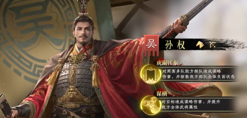 最后为大家推荐的就是这个孙权,孙权目前在游戏当中也是作为一个核心的武将出现,他主要带来的就是群体类型的伤害,因为技能效果上面孙权基本都是能够覆盖范围比较广的,此时利用技能触发一定输出的时候,还可以驱散敌方带来的一些增益,固有技能的效果上面还可以为我方友军带来攻防双属性的提升效果,所以后期再搭配一些弓兵武将的时候,带来的阵容效果上面如果大家将其中怒气的数值循环的比较好的话,那么整体的阵容属性加成就会比较多。