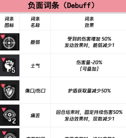 护盾类型的负面词条主要针对游戏中的防御体系进行搭建,直接影响了角色通过护盾获得的生存保障,其中伤口词条的作用是降低角色获取护盾的总量,效果一旦施加就会在回合内持续存在,没有主动消耗层数的限制,只能通过特定的词条技能或者道具进行净化,对依赖护盾进行防护的坦克角色或者辅助角色来说,伤口的效果是非常明显的,原本能提供充足的生存空间,但是在伤口的作用下也会大幅减弱,可能会导致前排角色快速的被击破,威胁后排的输出。
