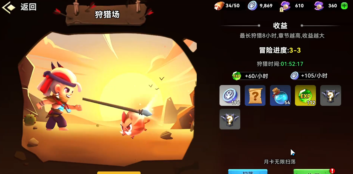 中后期主力产出场景为【狩猎场】玩法。该系统支持离线挂机与一键扫荡,前提是玩家已通关对应冒险章节。章节难度越高,单次扫荡获得的圣水数量越多;同时支持开启“自动分解”功能,智能处理低阶材料,进一步提升圣水转化率。