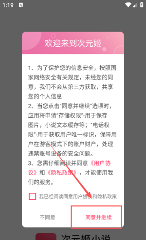 1、打开次元姬小说APP,点击同意按钮以顺利进入应用界面,确保接受所有相关协议。