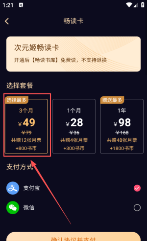 打开次元姬小说APP,点击右下角【我的】进入个人中心,选择【次元姬畅读卡】选项,根据需求挑选套餐(如月度/季度/年度)及支付方式,勾选协议后点击【确认支付】,完成支付即可开通畅读卡,享受全站小说免费阅读权益。