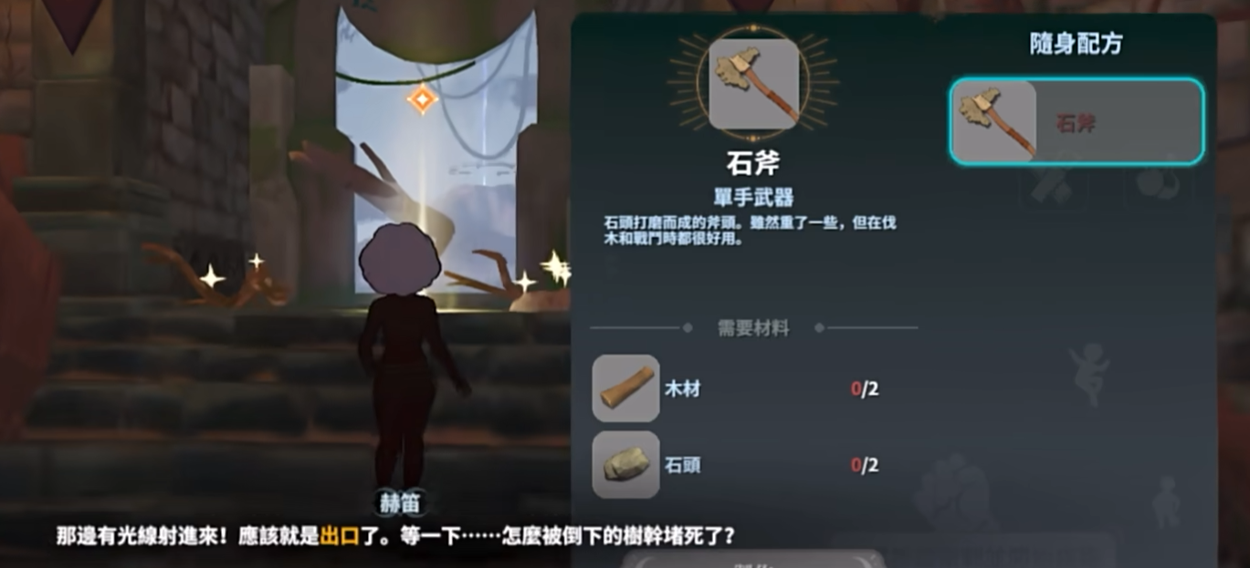 游戏开局即自动解锁“石斧”制作蓝图,无需额外探索或任务触发。材料获取路径极为便捷:首先进入出生点附近区域,采集2份木材;随后向地图外围移动,拾取2块普通石头;最后打开随身制作台界面,选择对应配方并确认合成,即可获得这把单手近战武器。该装备为前期清剿低等级野怪、采集资源的核心工具,操作门槛低、实用性高。